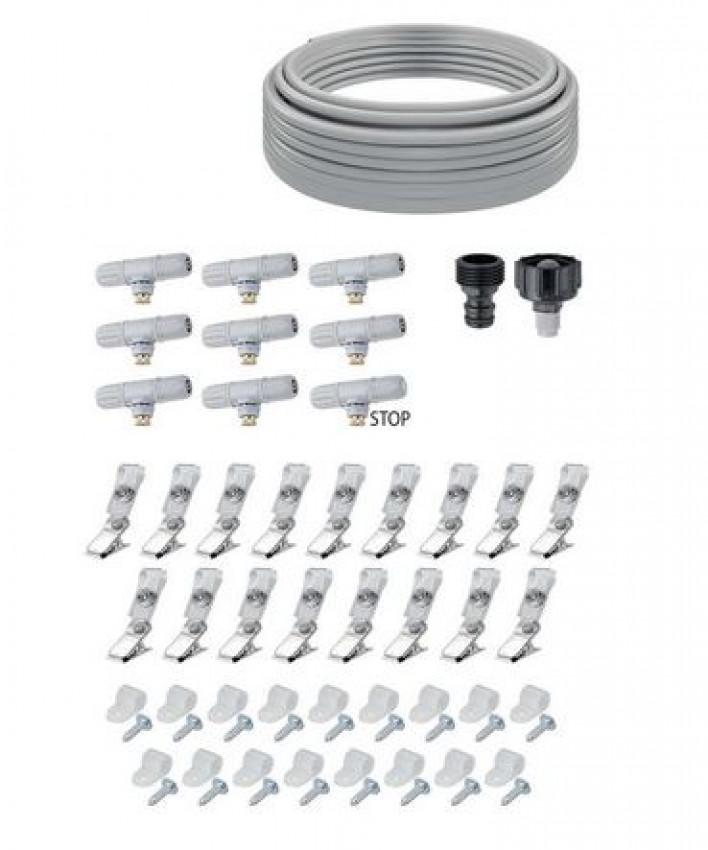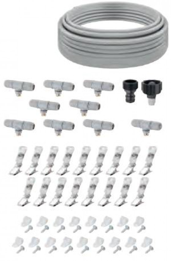 Набір охолодження мікротуманом ідеально підходить для охолодження відкритих приміщень у спекотні літні дні. Набір (складається зі шланга довжиною 12м, 9 форсунок для мікротуману, з'єднувачів і затискачів) можна легко зачепити на парасольки, альтанки та парасольки та підключити до крана (за допомогою подовжувача, який не входить в комплект). Розпилювачі мікротуману з латунними насадками випускають у повітря пару мікроскопічних крапель води, що дозволяє охолоджувати атмосферу до 6°С. Систему можна автоматично активувати, додавши таймер Aquauno Mist (не входить в комплект).