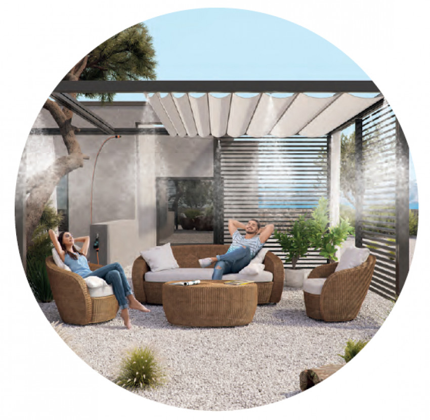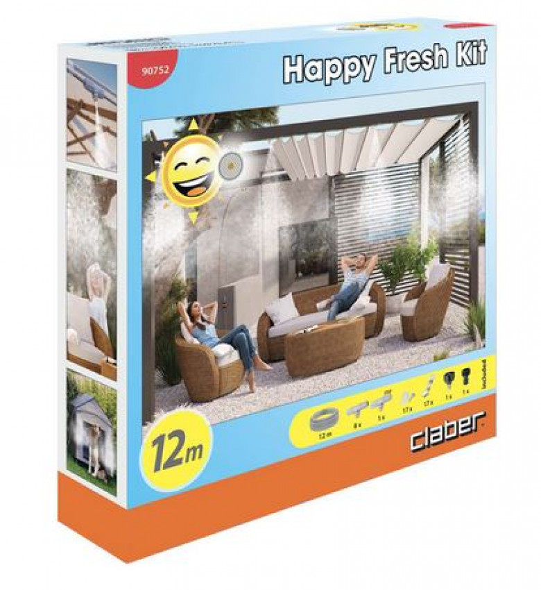 Happy Fresh — це практичний набір, розроблений Claber для охолодження повітря в спекотні літні дні в альтанці, в саду чи на терасі. Ефективні форсунки мікротуману створюють мікроскопічні краплі води, що виділяються в атмосферу і можуть знизити температуру повітря до 6 градусів, створюючи відчуття гарного самопочуття навіть у найспекотніші дні. Швидко збирається, Happy Fresh Kit можна легко зачепити на альтанки та парасольки; вам просто потрібен кран і подовжувач, щоб насолоджуватися прохолодою в чудові сонячні дні літа. Систему можна дооснастити з Aquauno Mist, новим універсальним таймером Claber з батарейним живленням, який дозволяє встановлювати частоту та час роботи системи розпилення.