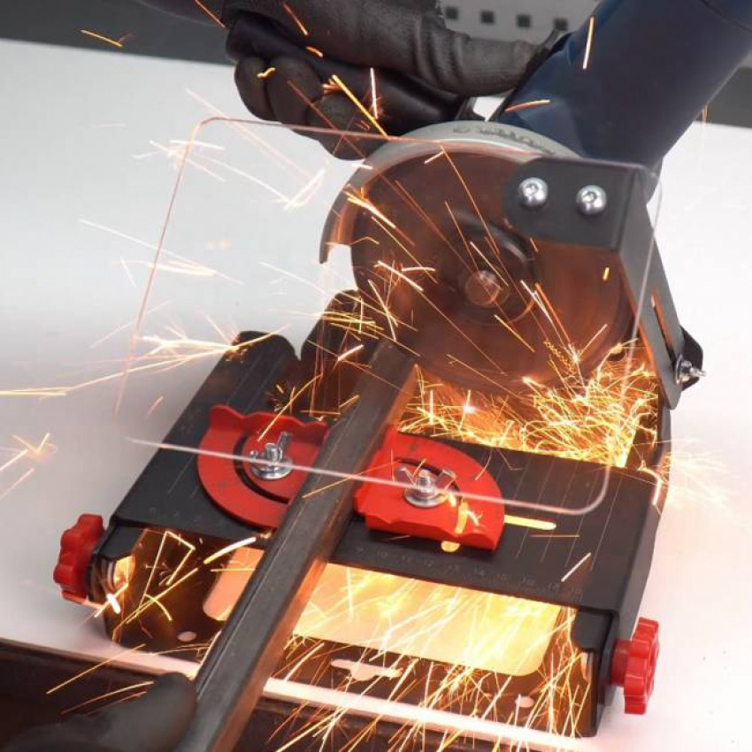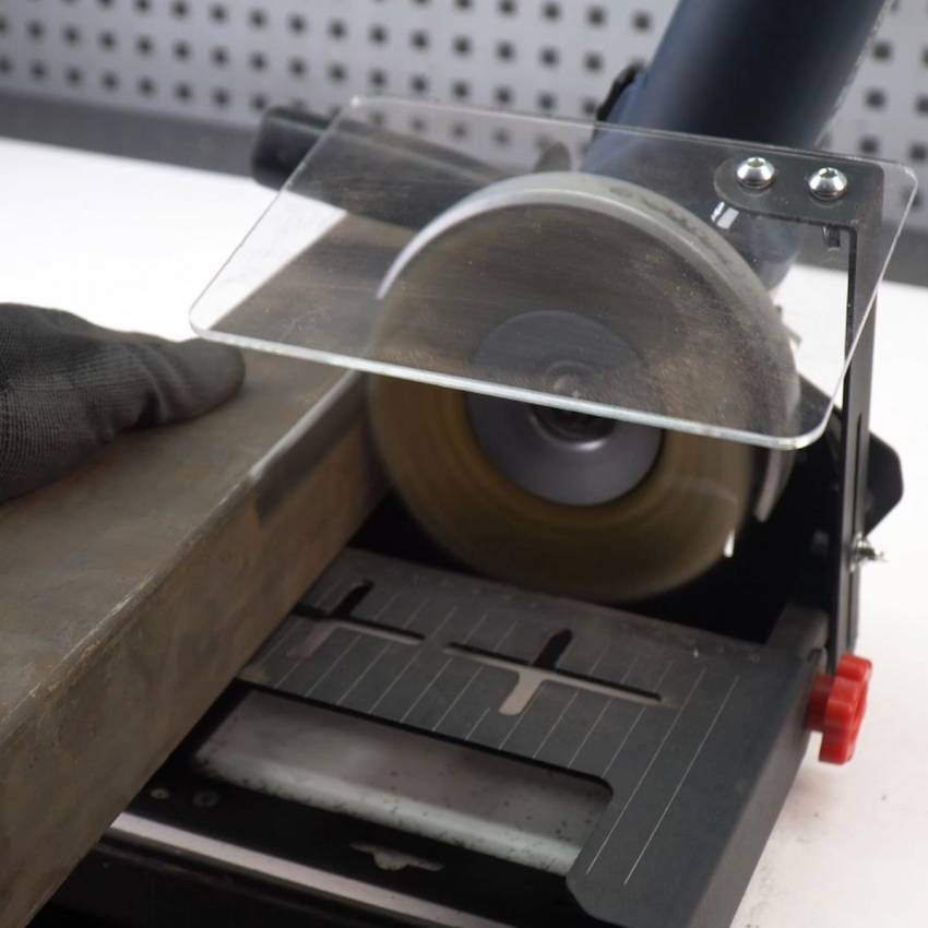 Слесарное приспособление крепится к столу струбцинами или шурупами. УШМ крепится к кронштейну приспособления в резьбовое отверстие редуктора. Поворотный стол и настраиваемые уголки позволяют размещать заготовку под различным углом по отношению к инструменту. На УШМ устанавливается любой инструмент: отрезные и зачистные абразивные и твёрдосплавные диски, металлические щетки, шлифовальные круги на липучке и другие.