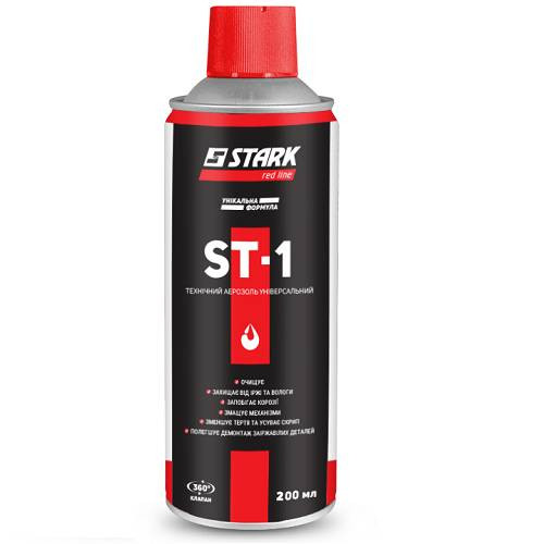 Stark ST-1 – аерозоль для запобігання корозії, мастила іржавих деталей, видалення жиру, мастил та клею. За допомогою аерозолю легше відкручувати болти, роз'єднувати вузли, деталі, що заклинили. Також універсальне мастило Stark ST-1 зменшує тертя деталей одна об одну. Створює захист від вологи, завдяки чому запобігає появі корозії на деталях. Мастило Stark ST-1 поставляється в балончику ємністю 200 мл із клапаном, який повертається на 360° для зручного використання в будь-якому положенні. Аерозольне мастило Stark ST-1 підходить як для професійного, так і побутового використання. Не залишає по собі жирні плями, завдяки відсутності у складі силікону.