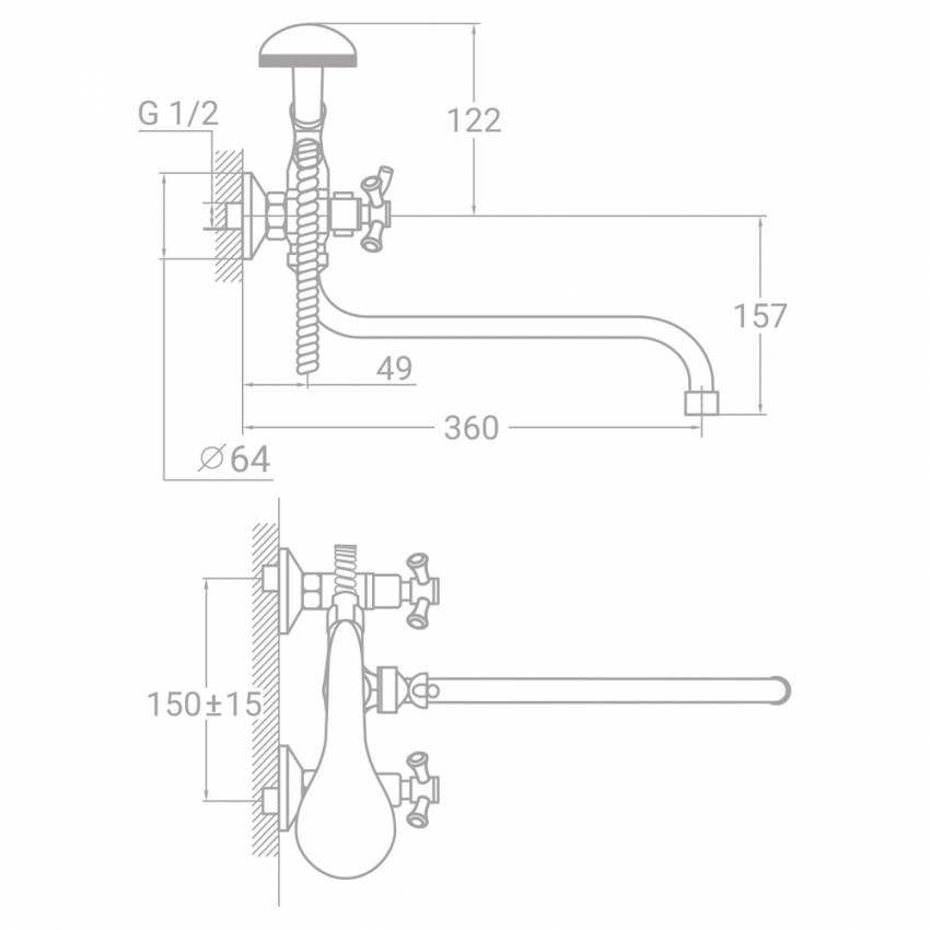 Характеристики Змішувач VN 1/2" для ванни гуска вигнутий дивертор.