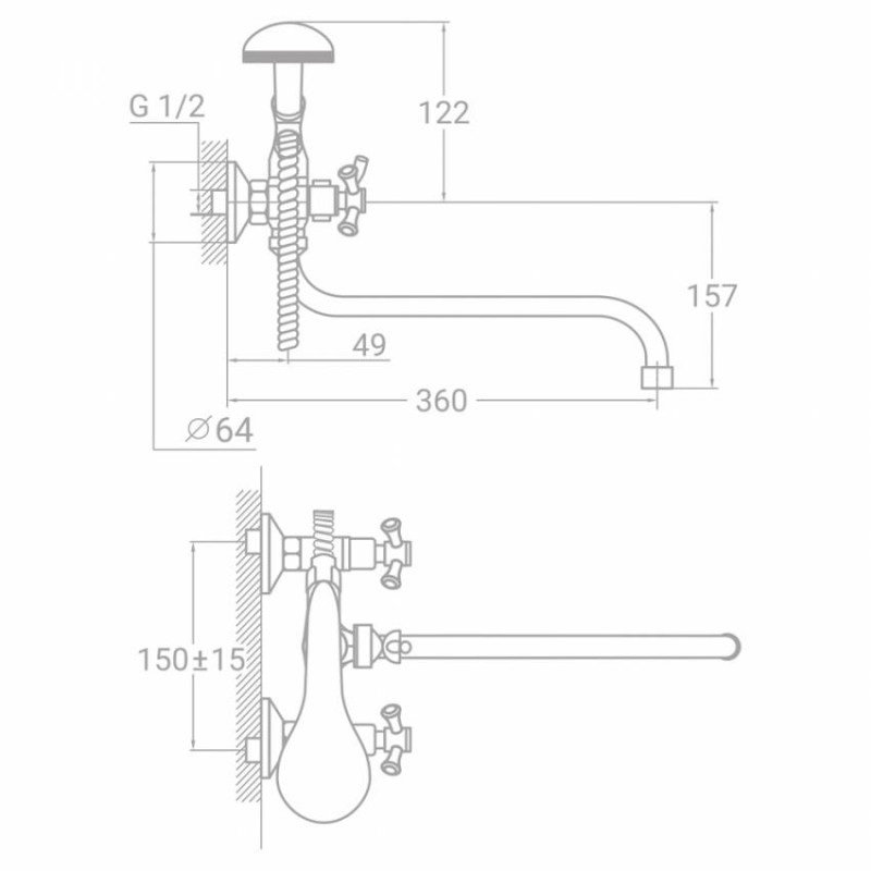 Шланг для душа (нержавеющая сталь, 1500 мм), лейка для душа (АВS-пластик, 1 режим), кронштейн (цинк)
