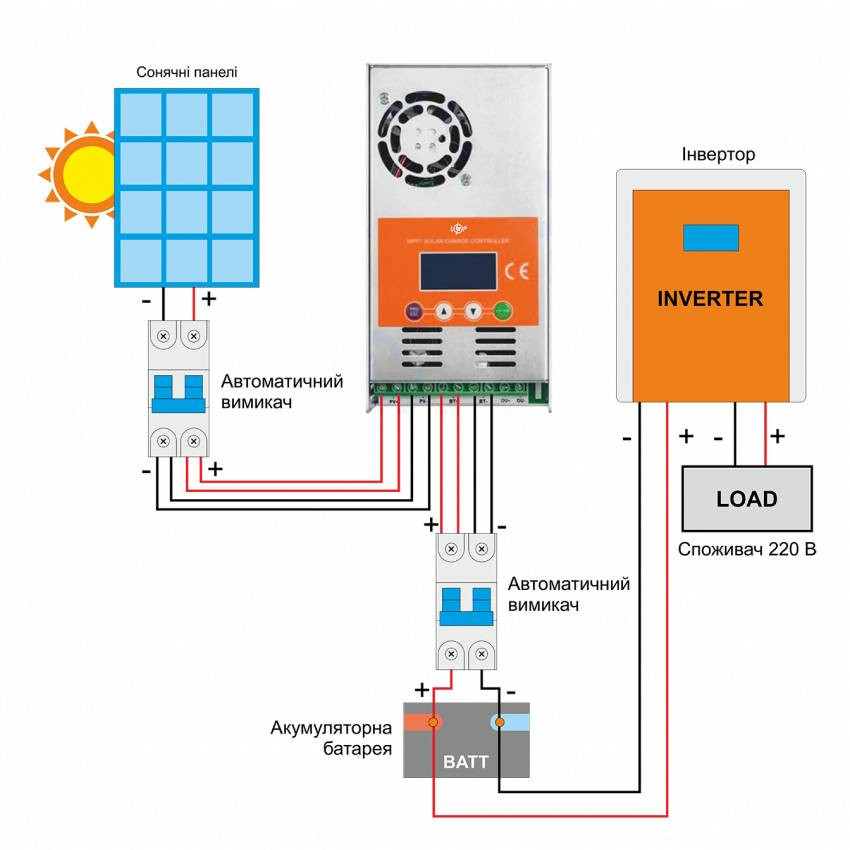 MPPT контролер дозволяє використовувати в системі стандартний ДБЖ із правильною синусоїдою. МРРТ контролер забезпечує максимально ефективне використання потенціалу альтернативних джерел енергії. Пристрій моніторить та автоматично вибирає оптимальне співвідношення сили струму та напруги, необхідних для максимальної потужності АКБ. Використання МРРТ контролера дозволяє збільшити ККД сонячних батарей на 20-30%;