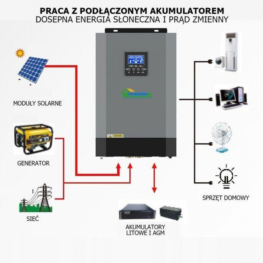 Цей інвертор забезпечує тривале безперебійне живлення електричних пристроїв, що потребують живлення 230В змінного струму, з можливістю вибору пріоритету живлення: мережа або сонячна батарея. Завдяки компактному дизайну його можна встановити навіть у невеликих приміщеннях або транспортних засобах.