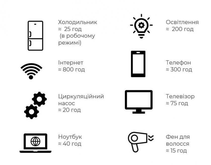 Коли відсутнє електропостачання - інвертор автоматично переводить в режим споживання від акумуляторів. Коли включається електропостачання інвертор заряджає акумулятори. При використанні у вашому приміщенні газового котла, холодильника, освітлення, інтернету, телевізора, комп'ютера. Даного комплекту вистачить до 15-26 год роботи до повного розряду. При максимальному використанні у 3 кВт або наступних приладів - циркуляційних насосів, фени, духовки електричні, посудомийки, пральні машини електричні плитки даного комплекту вистачить до 1 год. Час зарядки при повній розрядці акумуляторів в середньому 10-15 годин при умові оптимальної потужності заряджання 20 Ah що є безпечним та оптимальним для зарядки акумуляторів. В комплекті із двома акумуляторами AGM (Absorbed Glass Mat) ємністю 130 Аг потужністю 12V які при паралельному з’єднанні нададуть необхідні 24V для роботи інвертора загальною ємністю 2500 Вт/год.