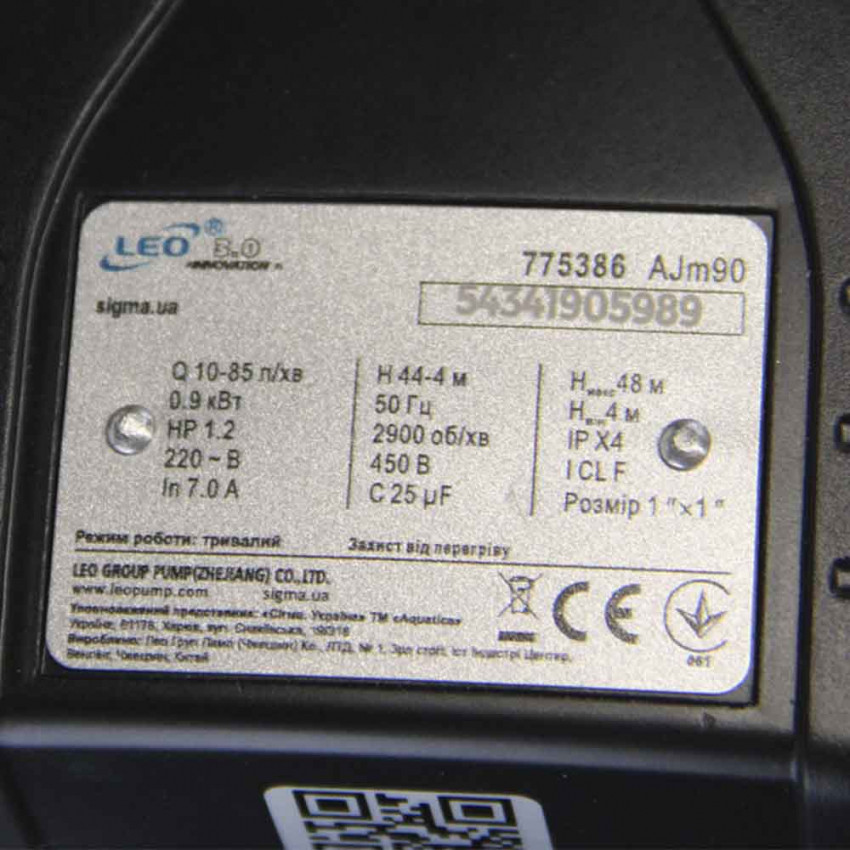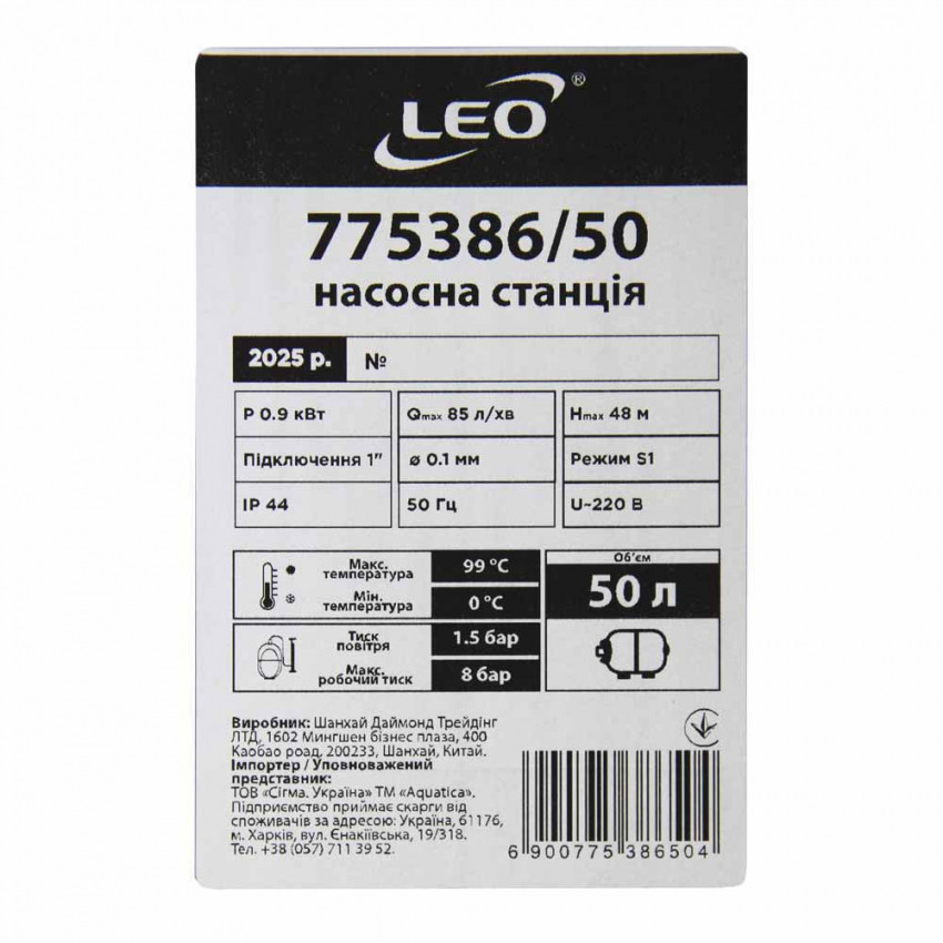 Характеристики Станція 0.9кВт Hmax 48м Qmax 85л/хв (самовсмоктувальний насос) 50л Україна LEO (775386/50)