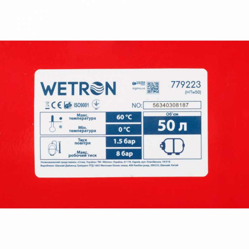 Характеристики Станція 1.1кВт Hmax 45м Qmax 85л/хв (самовсмоктувальний насос) 50л Україна WETRON (775035/50)
