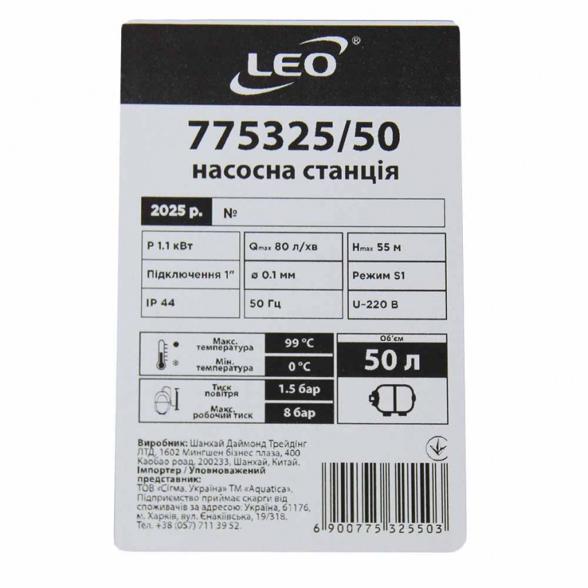 Характеристики Станція 1.1кВт Hmax 55м Qmax 80л/хв (самовсмоктувальний насос) 50л Україна LEO (775325/50)