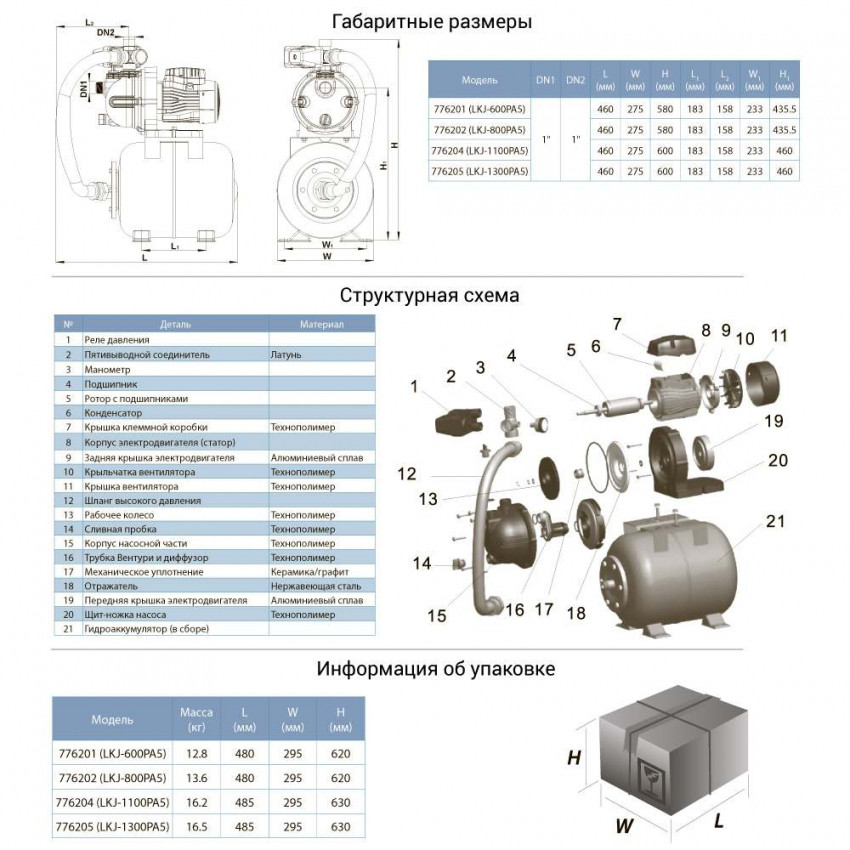 Станції водопостачання обладнані гідроакумулятором 24 літра і керуючої автоматикою. Станції призначені для перекачування чистої води і можуть застосовуватися: для побутового водопостачання, допоміжного обладнання, підйому води в трубопроводах низького тиску, для зрошувальних систем садів і городів, теплиць і парників. Реле тиску управляє роботою електронасоса - настройка реле тиску Р (вкл) 1.8 бар / Р (викл) 3.2 бар.