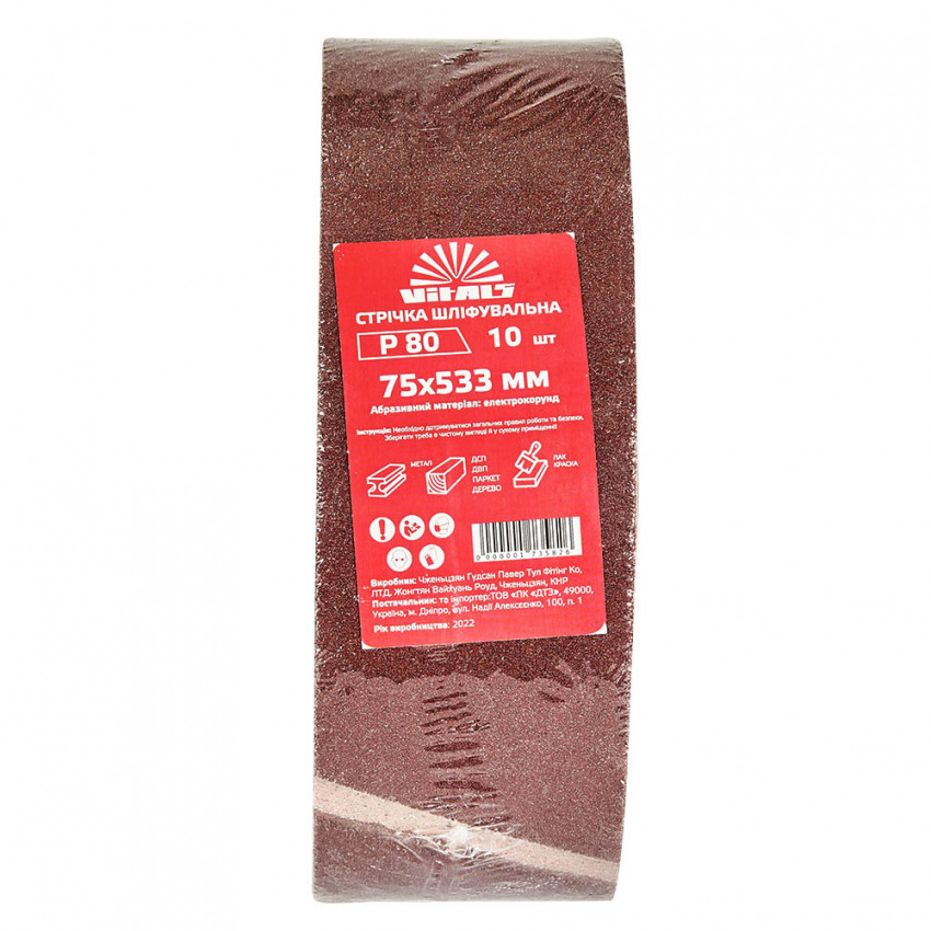 Стрічка шліфувальна Vitals 75х533 мм призначена для робіт з ДВП, ДСП, твердою деревиною, паркетом, лакофарбовими покриттями, металом.