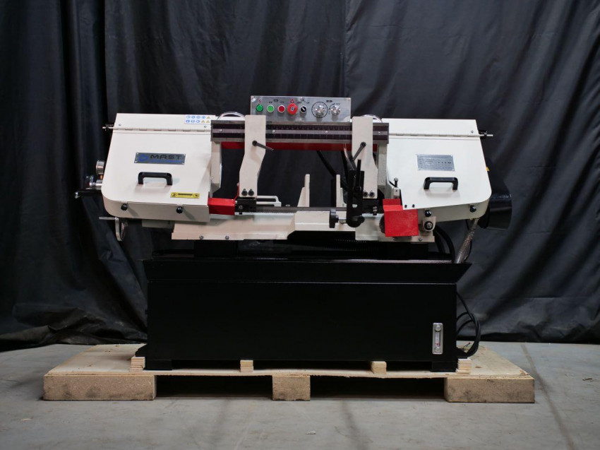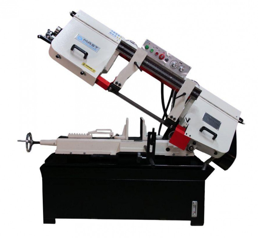 Стрічкова пила по металу MAST Metalltechnik M-BS 450 - це професійне обладнання для різання сталі (високолегованої, інструментальної, нержавіючої), чавуну та кольорових металів, ємність різання якого становить 450х200 мм при 90° та 190х254 мм при 45°. Висота ріжучого полотна 27 мм дозволяє якісно та швидко різати великі суцільнометалеві заготовки, а 4 швидкості руху полотна (25/40/51/71 мм) - адаптувати параметри обробки під особливості матеріалу. Асинхронний двигун потужністю 2,2 кВт відмінно витримує навантаження і не потребує обслуговування.