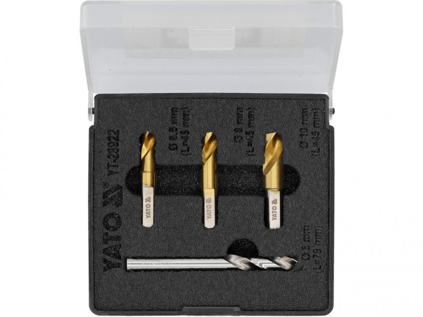 Свердла для точкового зварювання HSS YATO Ø= 6.5х 45мм, Ø= 8х 45/79 мм, Ø=10х 45 мм, 4 шт. у футлярі