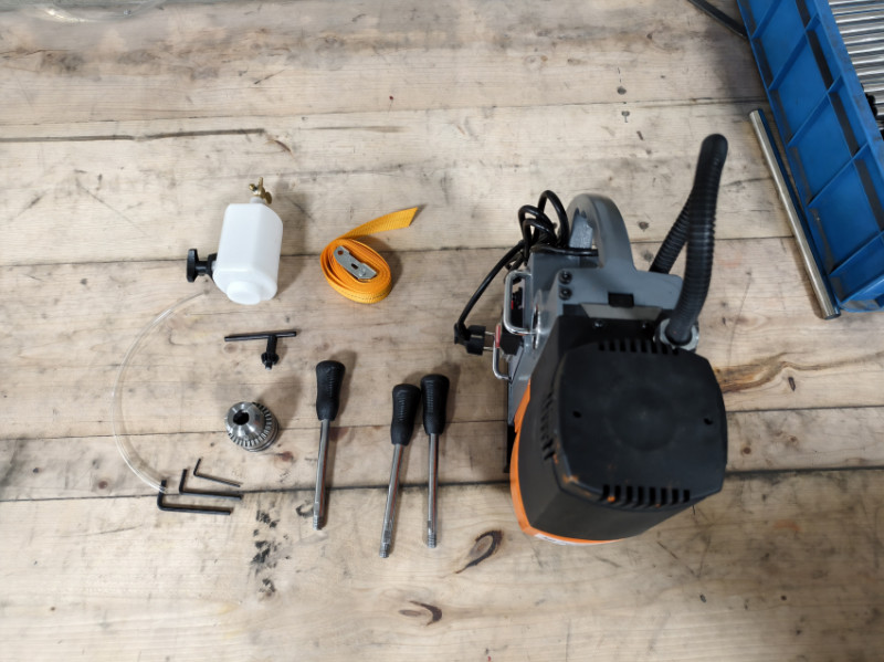 Свердлильний верстат MCD32 (1400 Вт, 450 об/хв) призначений для свердління отворів у металі за допомогою коронок або свердел. Потужність двигуна — 1400 Вт, оберти шпинделя — 450 об/хв. Оснащений електромагнітним тримачем із силою притягування 14000 Н, що забезпечує надійну фіксацію на вертикальних і горизонтальних поверхнях. Має хід шпинделя 175 мм. Діаметр свердління коронкою — від 12 до 32 мм, спіральним свердлом — до 16 мм. Підтримується кріплення оснастки Weldon 19,05 мм або під патрон 16 мм.