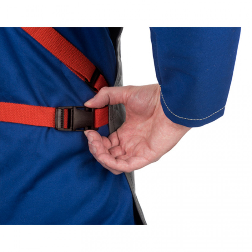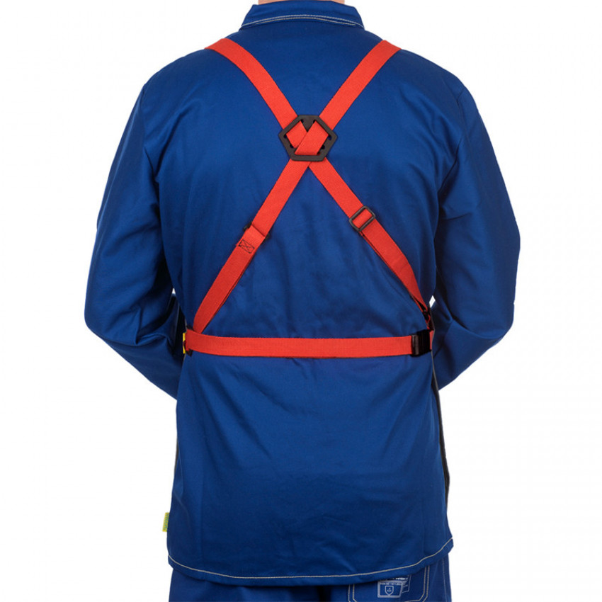 Захисний фартух Weldas W.38-4342 з надміцної вогнестійкої бавовни, щільністю 520 г/м2. Відзначається високим рівнем гнучкості, не сковує рухи. Вогнестійкий матеріал дозволяє працювати в умовах підвищених температур. Саморегулююча система ремінців допоможе легко та зручно підігнати фартух по фігурі. Шви фартуха прошиті вогнетривкою кевларовою ниткою (Kevlar® 3 жили).