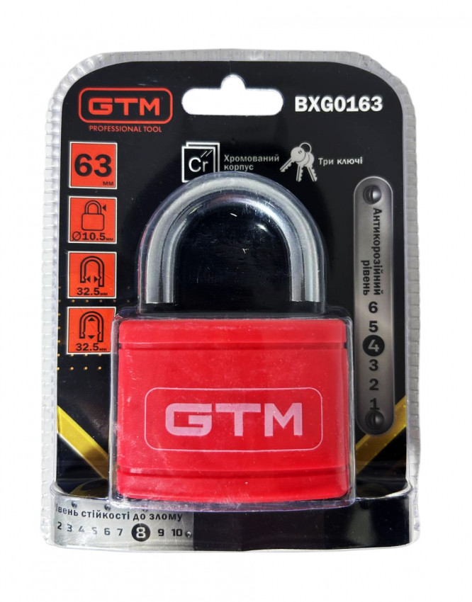 Навісний замок GTM BX0163 має стандартний розмір 63 мм.