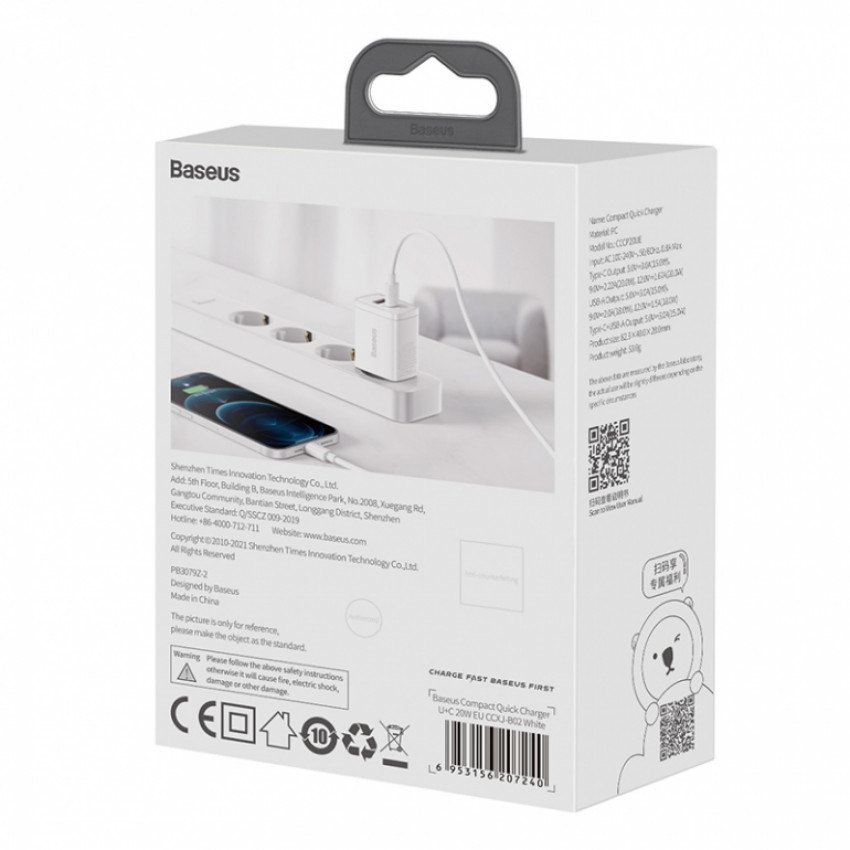 Про товар Зарядний пристрій Baseus Compact Quick Charger USB+Type-C 20W Білий (CCXJ-B02)