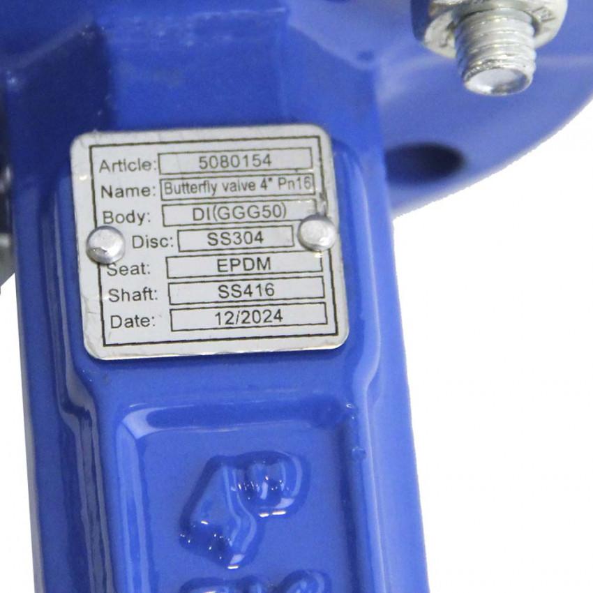 Затвор міжфланцевий «батерфляй» 4'' корпус чавун (GGG50) диск нерж (SS304) EPDM PN16 FLORA (5080154)
