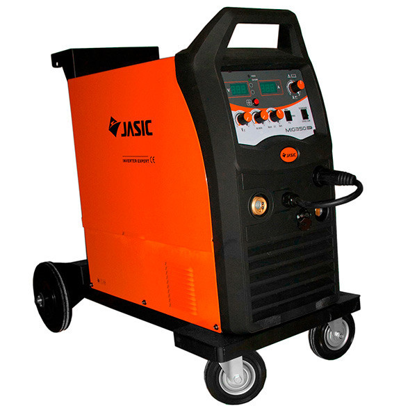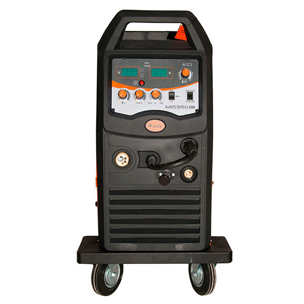 Jasic MIG-350 (N271) – це професійний зварювальний інвертор, який може використовуватися для напівавтоматичного зварювання в середовищі захисних газів (MIG/MAG), а також для ручного дугового зварювання (MMA). Апарат працює як дротом суцільного перерізу, так і порошковим (потрібна заміна роликів механізму подавання дроту).